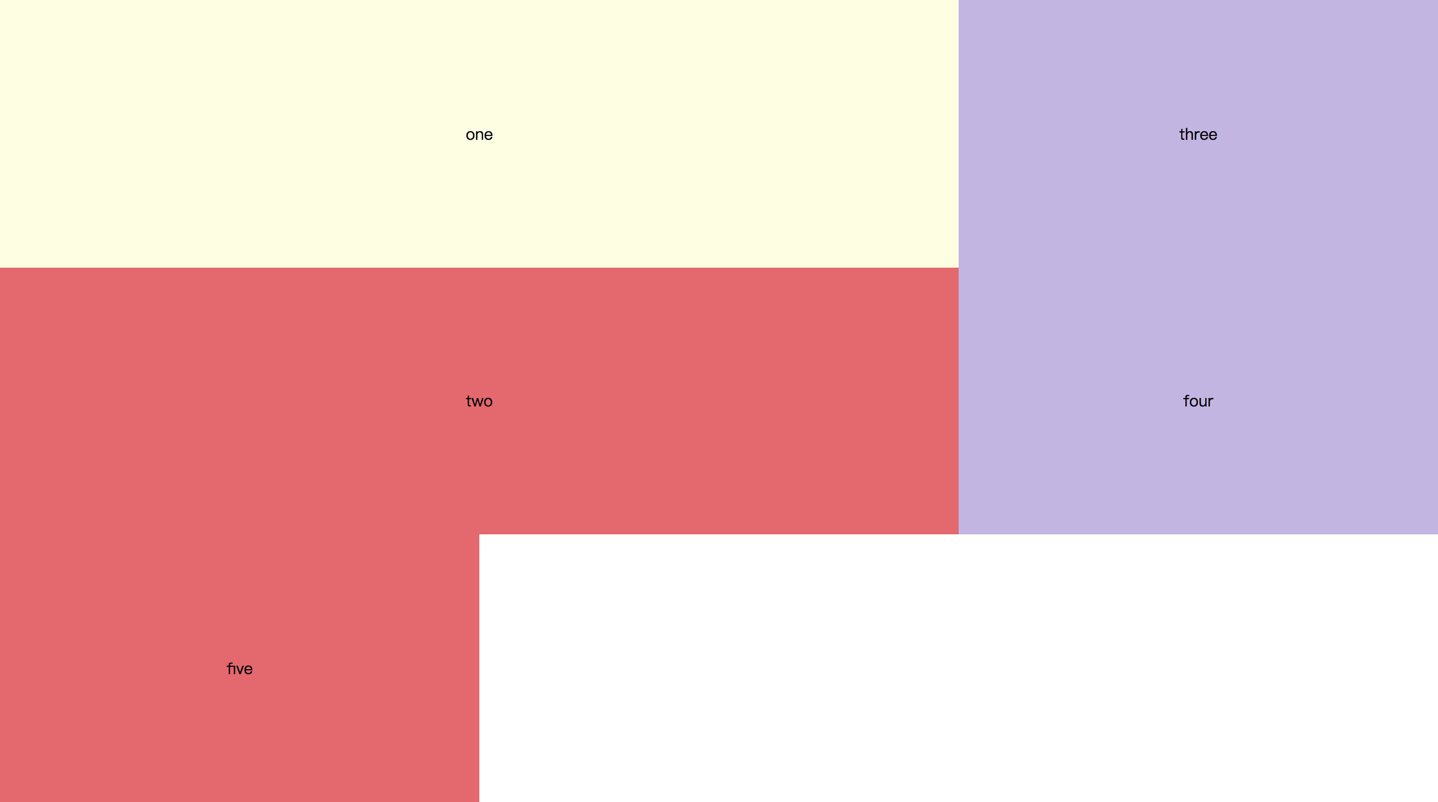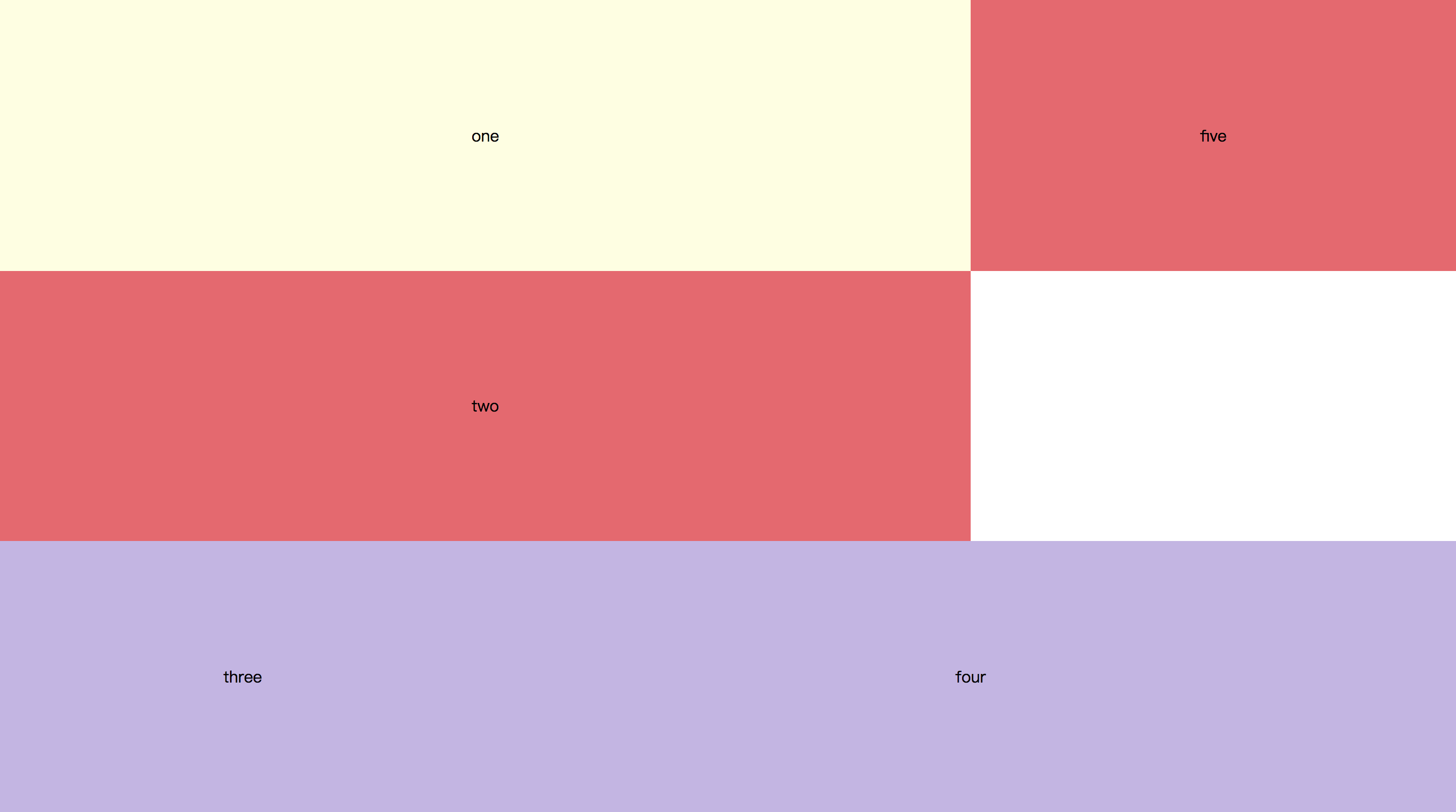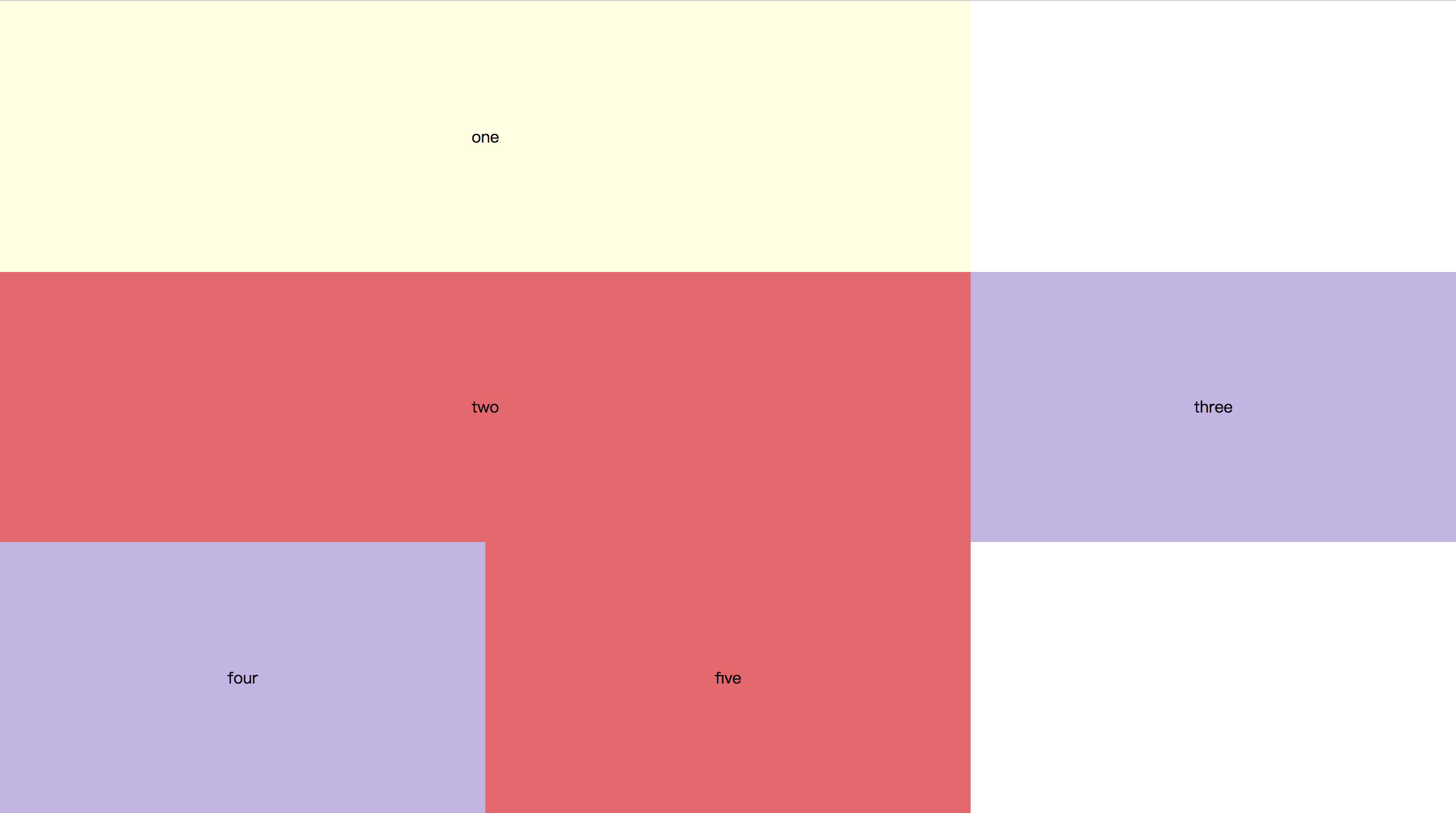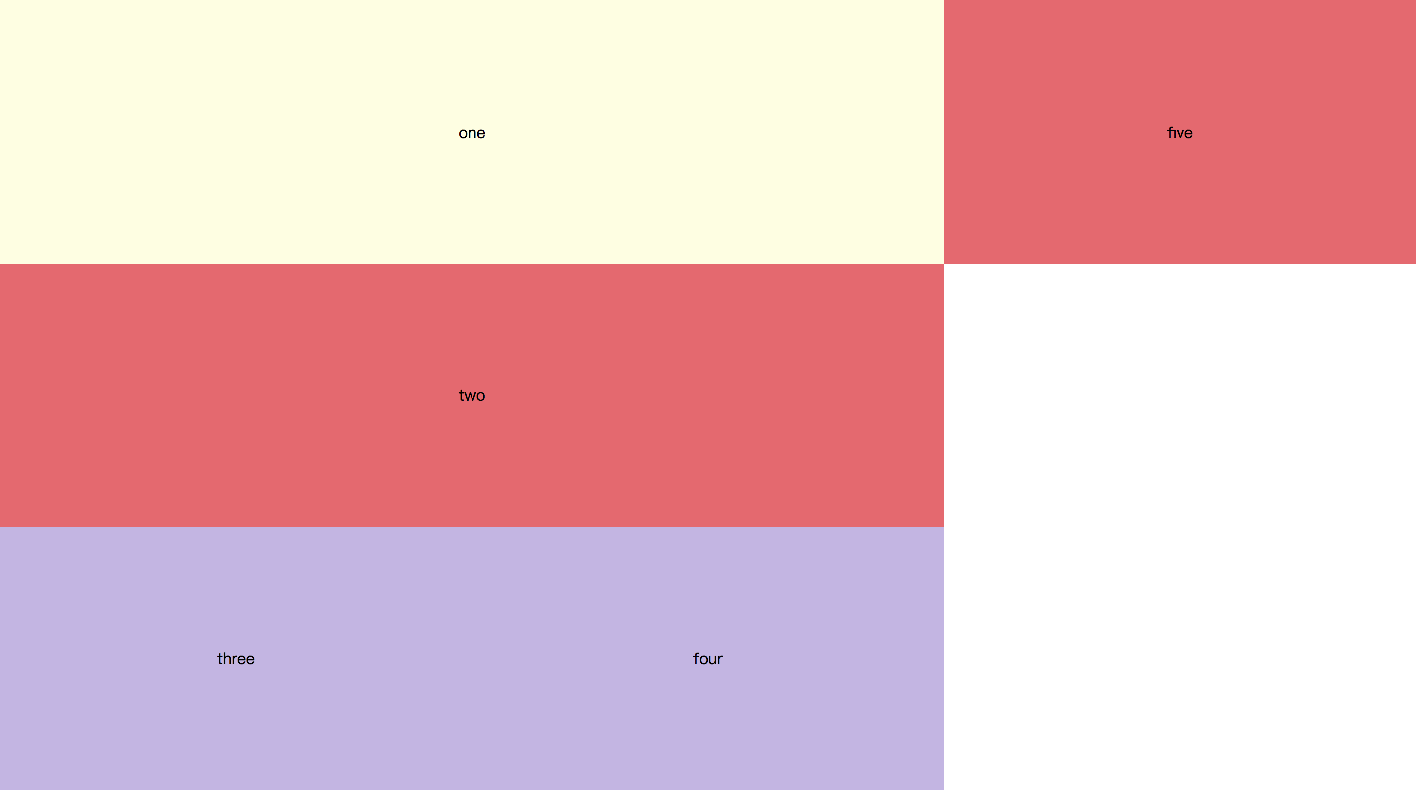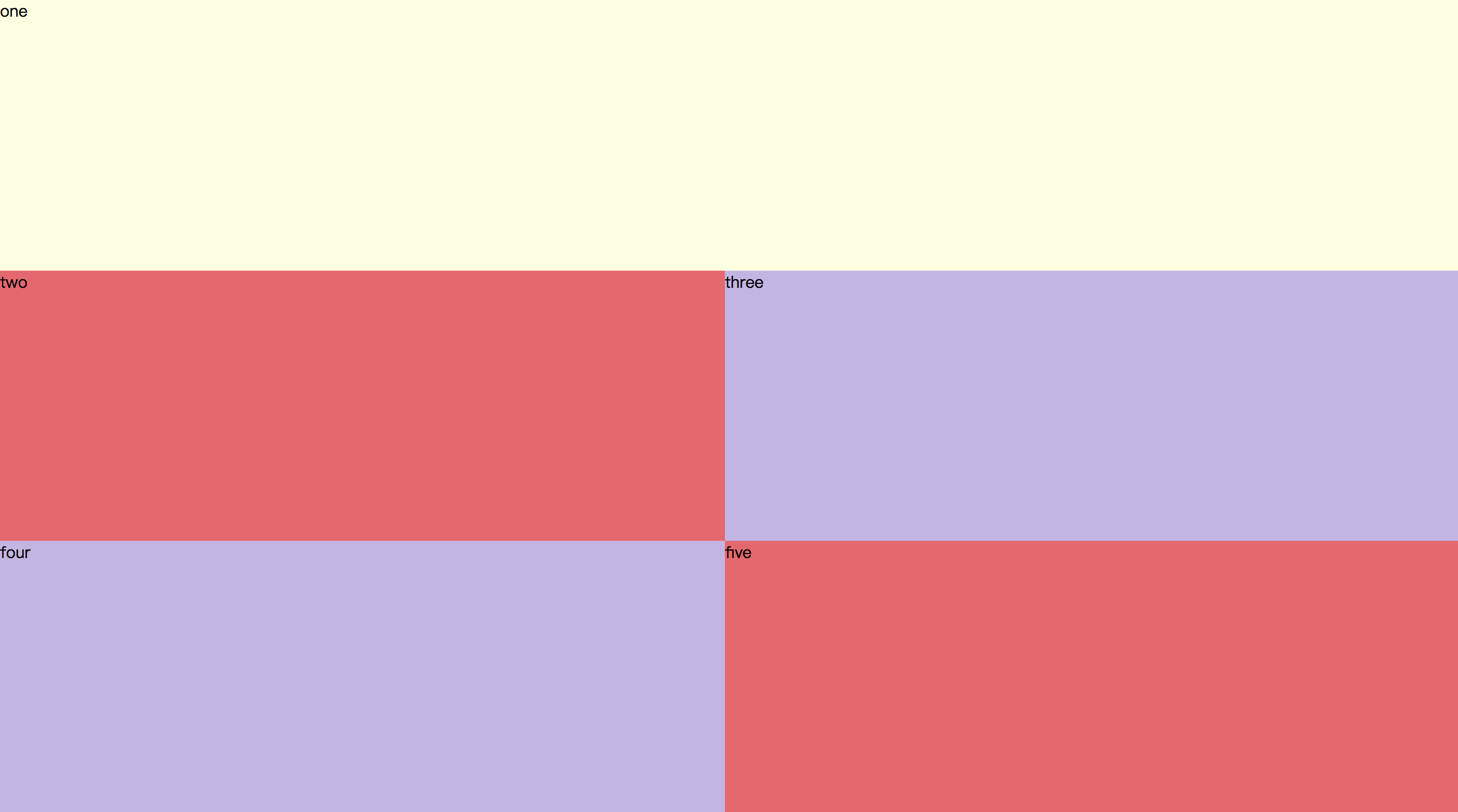 .container { display: grid; width: 400px; grid-template-areas: "one one" "two three" "four five"; } .one { grid-area: one; } .two { grid-area: two; } .three { grid-area: three; } .four { grid-area: four; } .five { grid-area: five; }会形成以下布局: