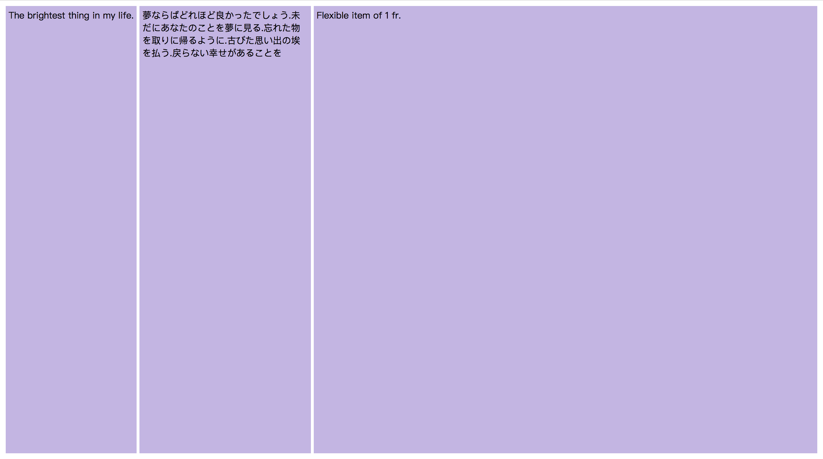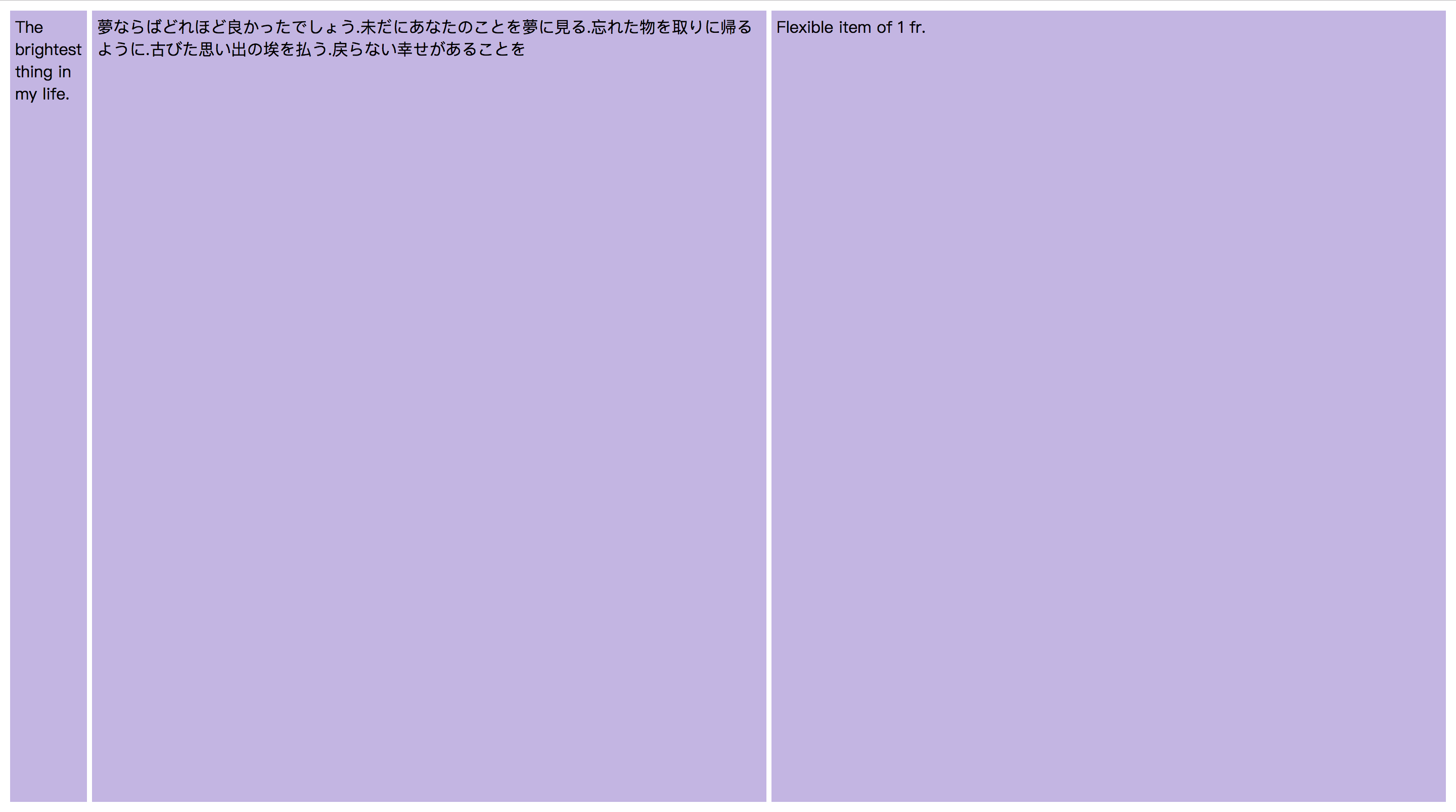 这个值的意思是,取内容区最小宽度值的最大值。典型的例子就是以上,英文单词是默认不换行的,所以取最长的一个单词brightest所占据的宽度为此div的宽度。中间部分取1fr,与右边部分的1fr,按1:1的比例,分割剩余的空间。 - fr