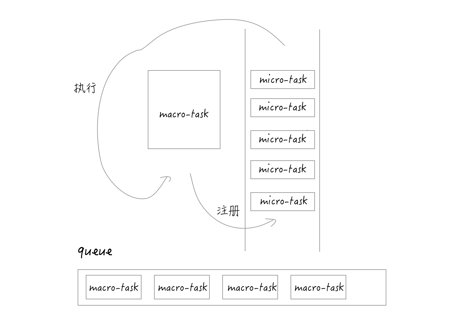 整个过程大致上如图所示,对于一次宏任务的执行,如果遇到了微任务,那么添加到微任务队列中。当前宏任务执行完毕后(其实是同步代码执行完毕后),检查微任务队列,按先进先出的顺序执行微任务,直到微任务队列为空,这一次宏任务真正执行完毕,开始下一个宏任务。